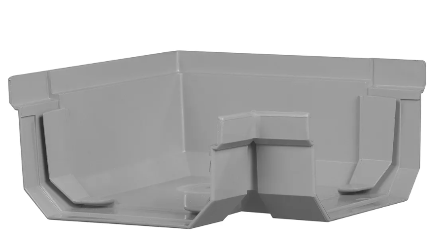 De PVC ESL bakgoot buitenhoek 95 mm (grijs) wordt gebruikt om twee gootdelen onder een binnenhoek met elkaar te verbinden. Dit hoekstuk zorgt voor een waterdichte en nette overgang van de dakgoot bij hoeken die naar binnen lopen, bijvoorbeeld bij een aanbouw of binnenhoek van het dak.