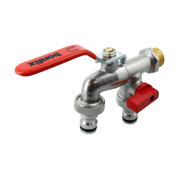 De BONFIX dubbele kogeltapkraan met buitendraad 1/2" x 3/4" x 3/4" en slangtule is een hoogwaardige messing kraan met twee afzonderlijk bedienbare uitgangen. Deze kraan biedt de mogelijkheid om bijvoorbeeld gelijktijdig een tuinslang en een ander watersysteem aan te sluiten. Dankzij de geïntegreerde slangtule sluit je eenvoudig een slang aan zonder extra koppelingen.