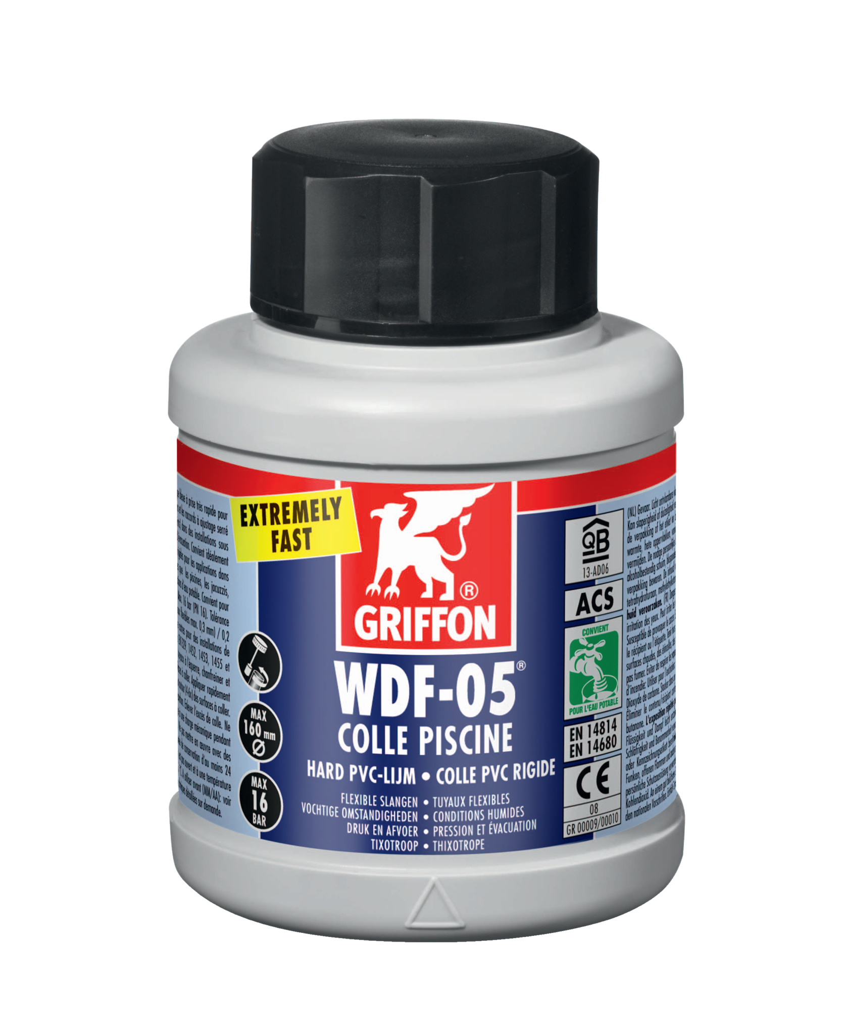 Griffon WDF-05. Zeer snel drogende blauwe PVC lijm voor het verlijmen van (flexibele) slangen. Uitermate geschikt voor toepassingen onder vochtige omstandigheden. zwembaden. whirlpools. enz. Voor diameters t/m 160 mm 250 ml.
