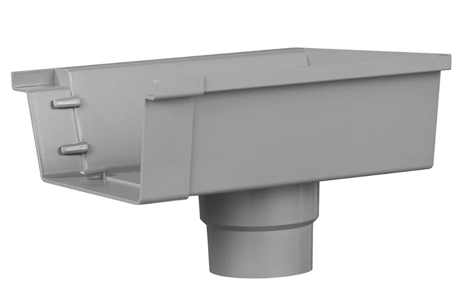 De PVC bakgoot einduitlooprechts derdeel. Deze uitloop sluit de goot aan de rechterzijde netjes af en voert het regenwater direct af naar de regenpijp of HWA-leiding.