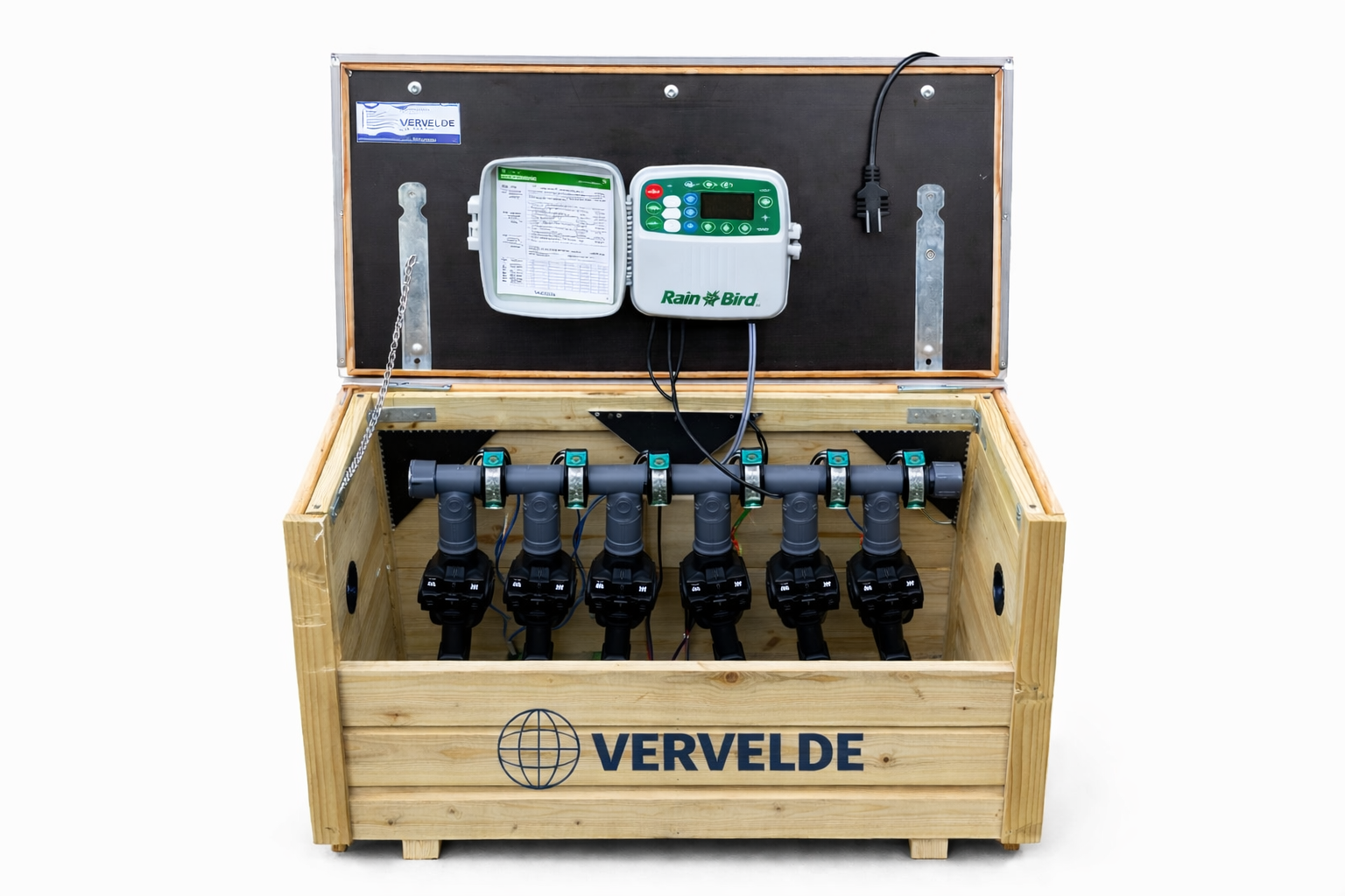 Deze prefab verdelerkast van Vervelde is een complete en robuuste totaaloplossing voor tuinberegening met water uit de sloot. Het volledige systeem wordt voorgemonteerd geleverd: de RainBird computer, de zes magneetventielen, de pomp én een hoogwaardig slootfilter voor een veilige en betrouwbare aanzuiging. Hierdoor hoef je niets meer zelf te bouwen of te puzzelen — aansluiten en draaien. De kern van het systeem is de RainBird sproeicomputer, die zes onafhankelijke beregeningszones aanstuurt. Zo kun je grote gazons, borders, plantvakken, nevelaars of druppelslangen elk precies het water geven dat ze nodig hebben. De RainBird manifold met zes magneetventielen is overzichtelijk in de kast geplaatst, zorgvuldig getest en gebouwd voor langdurige, storingsvrije werking. Voor de watervoorziening is dit model uitgerust met een krachtige pomp die speciaal is voorbereid voor aanzuiging uit de sloot. Om het systeem te beschermen tegen vuil, algen en zwevende deeltjes wordt standaard een professioneel slootfilter meegeleverd. Dit filter voorkomt verstoppingen en zorgt ervoor dat de pomp en sproeiers schoon en probleemloos blijven functioneren, zelfs in seizoenen met troebel slootwater. De aanzuigleiding wordt via de onderzijde van de kast doorgevoerd, volledig afgewerkt met rubber afdichtingen zodat vocht en vuil geen kans krijgen. De installatie is geschikt voor zowel PE-leidingen (tyleen) als PVC, waardoor je eenvoudig kunt aansluiten op je bestaande leidingwerk.